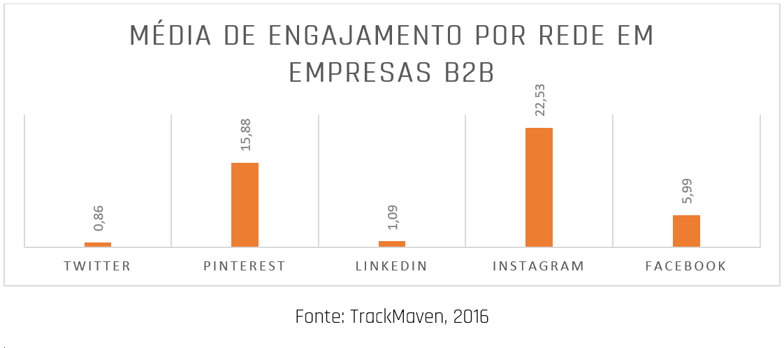Entretanto, em um estudo de 500 mil postagens em redes sociais e 100 milhões de interações sociais, a TrackMaven apresentou achados surpreendentes. O Instagram pode gerar até 20 vezes mais engajamento do que o LinkedIn para empresas B2B.
