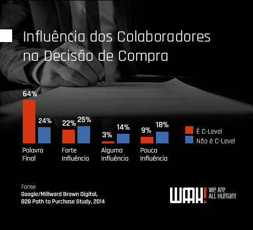 Como executivo de marketing, mais de uma vez ouvi da equipe de vendas que esse ou aquele analista decidia a compra. Eu queria embasar meu discurso de vendas pensando no decisor e, quando fazia isso, mirava em algum diretor ou C-Level. E insistia com eles que, para encurtar o caminho da venda, deveríamos chegar o quanto antes nesse decisor. Acredito que esse pensamento continue sendo válido, mas não podemos desconsiderar o papel dos influenciadores em uma decisão de compra.Segundo uma pesquisa realizada pelo Google em parceria com a Millward Brown Digital, 81% dos colaboradores de uma empresa influenciam as decisões de compra.
